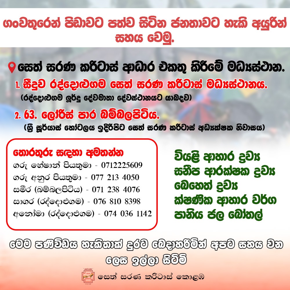 The recent floods and heavy rains have caused immense suffering across our beloved Sri Lanka. Many families have lost their homes, belongings, and sources of livelihood. I appeal to your generosity and compassion to stand with those affected during this time of crisis. Your donations and support will provide urgent relief—food, shelter, and care—to those in need. Together, let us show the love and solidarity of our Church to help rebuild lives.